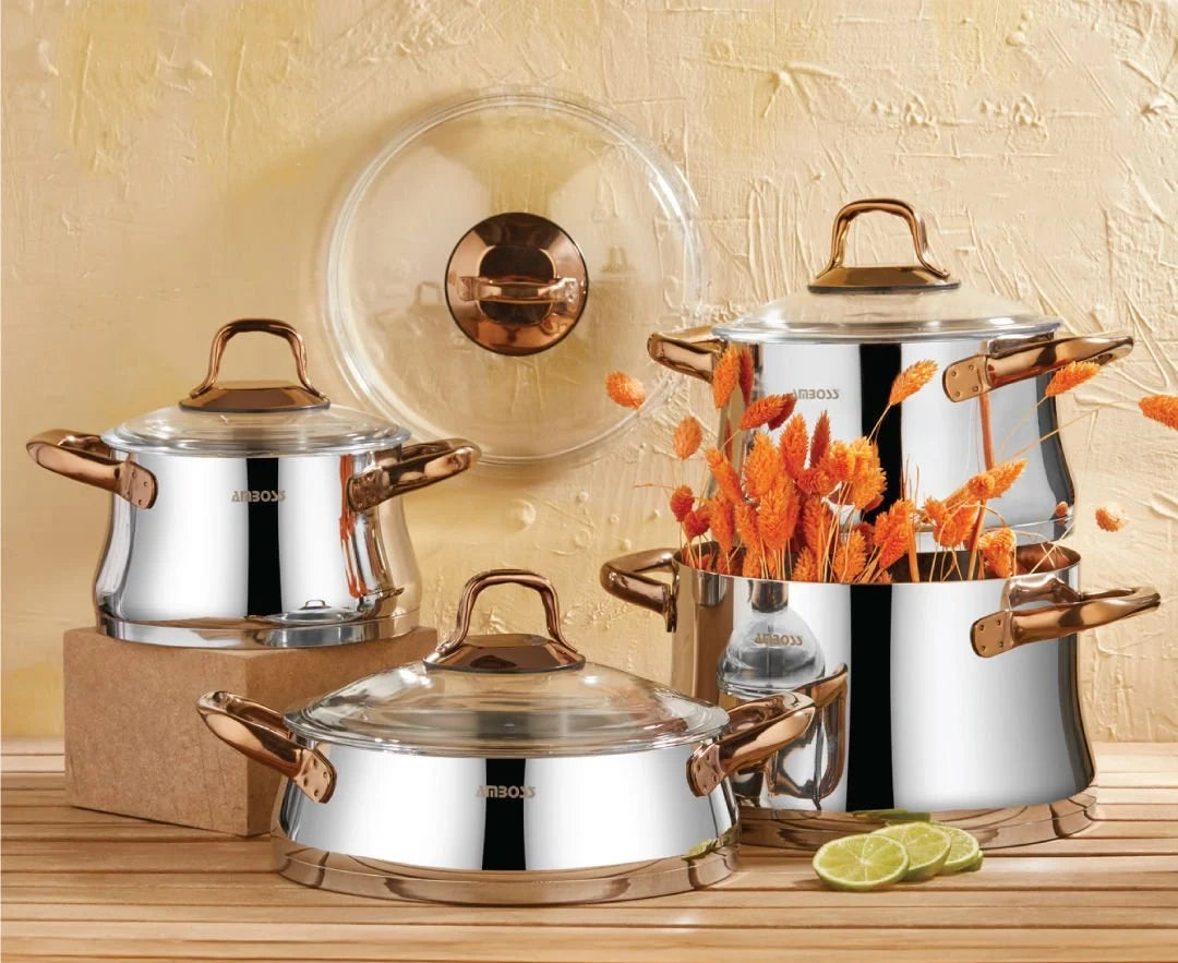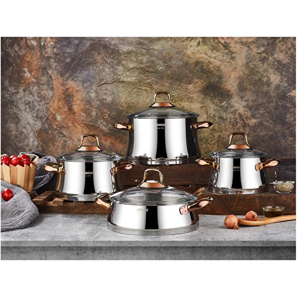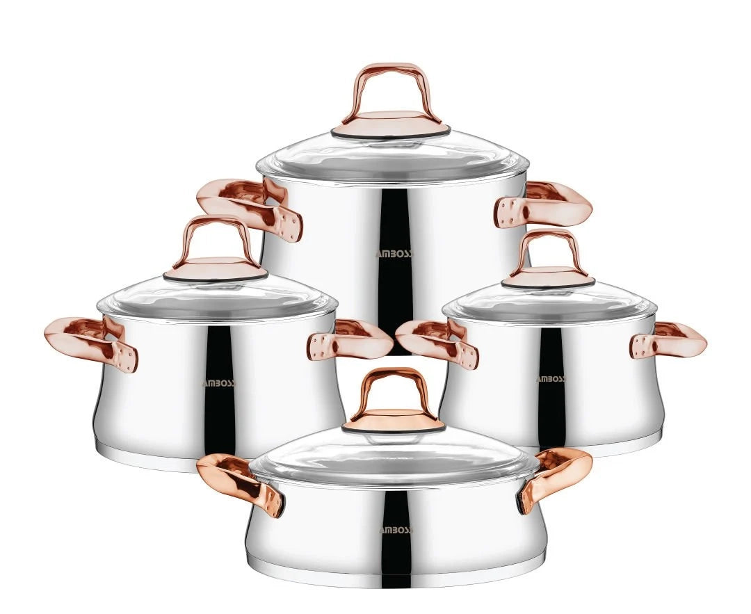 Batterie de cuisine Amboss Oregon 8 pièces en acier inoxydable avec couvercle en verre et poignée en cuivre
